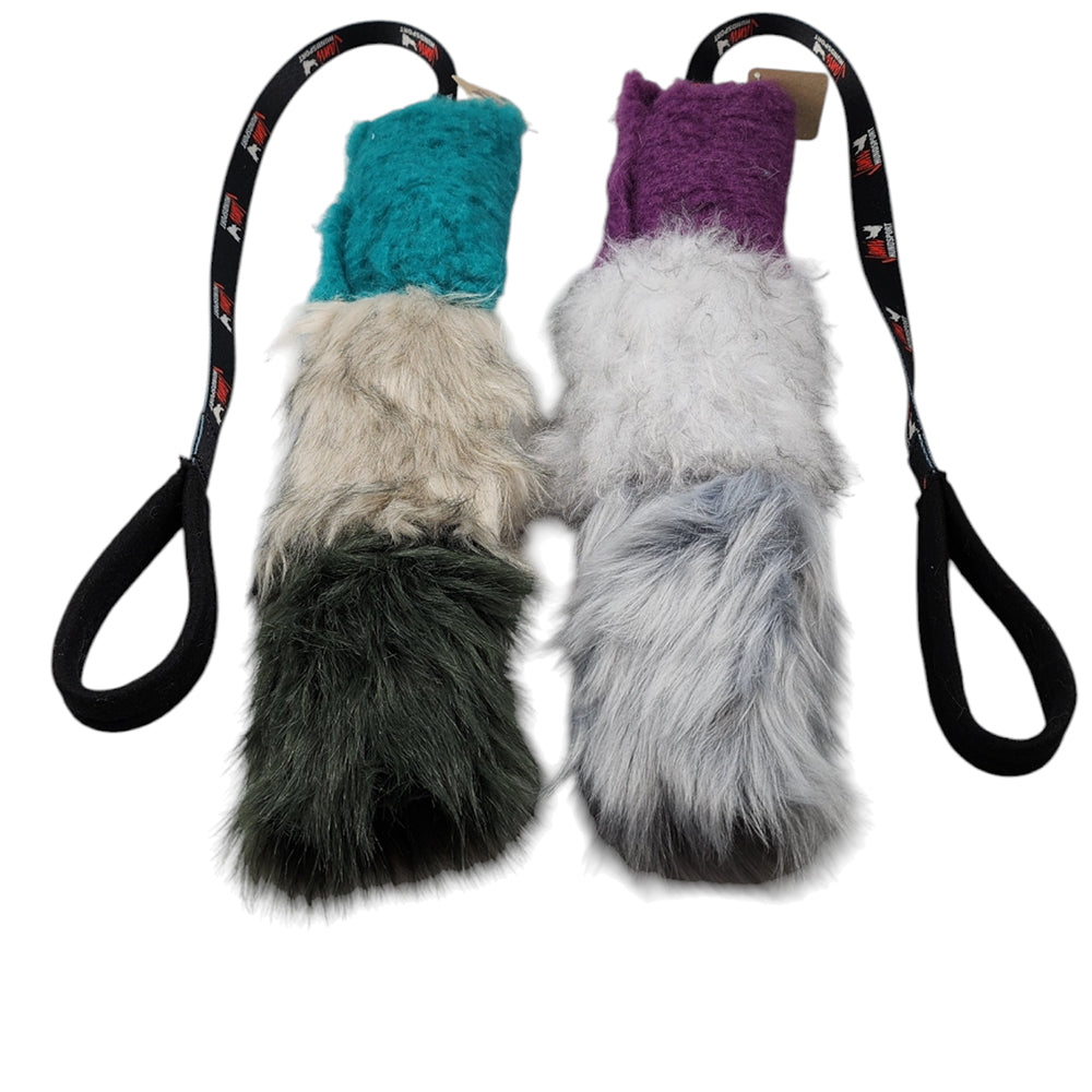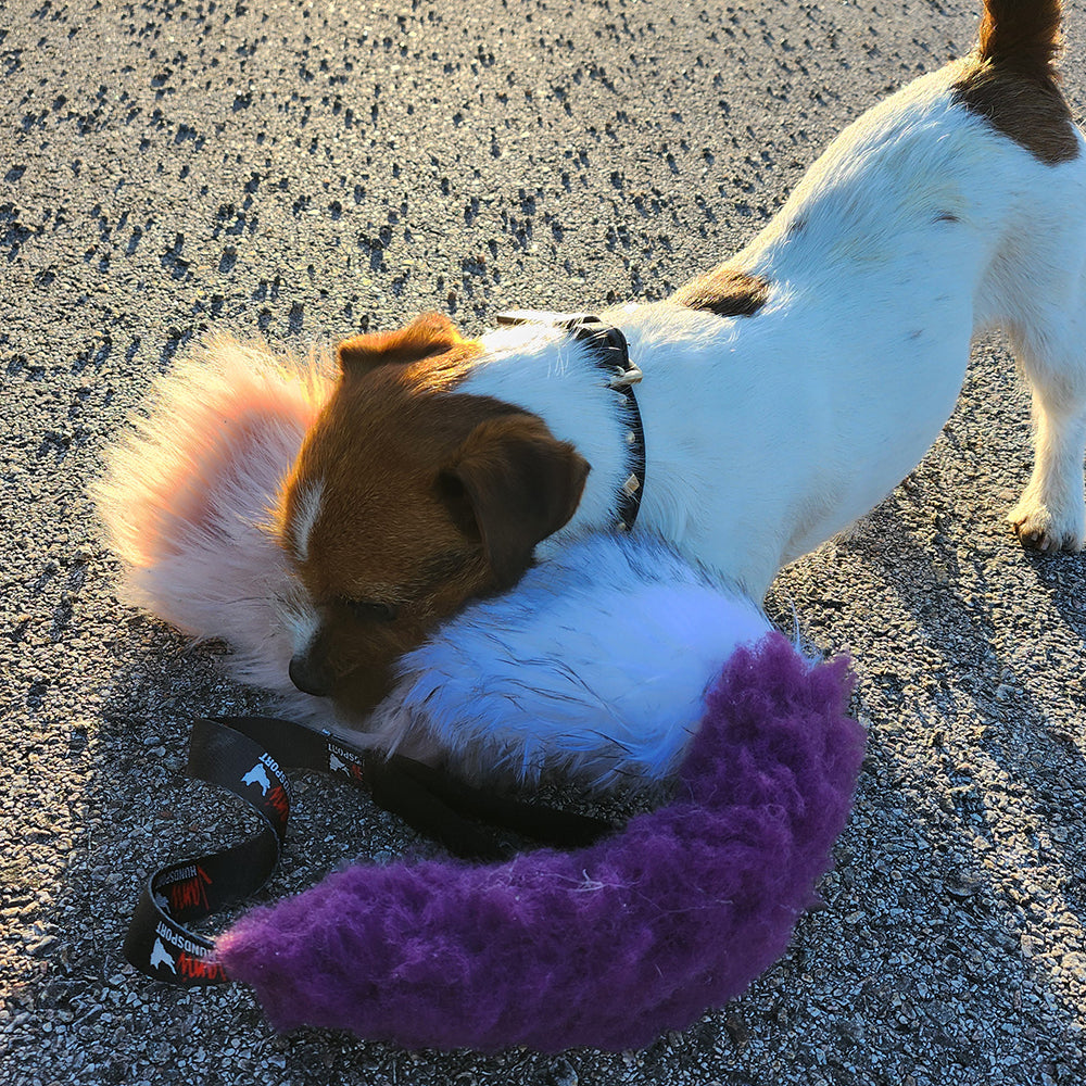 En morsom belønningsleke med pip og fjuskepels. Den består av 3 forskjellige falske fluff, en med pipelyd og en med knitrelyd og et langt sterkt bånd med fleecefôret håndtak. Fluffdelen er 50 x 10 cm og leken er hele 1,15 meter lang totalt! Supermorsom jaktleke som varer lenge!