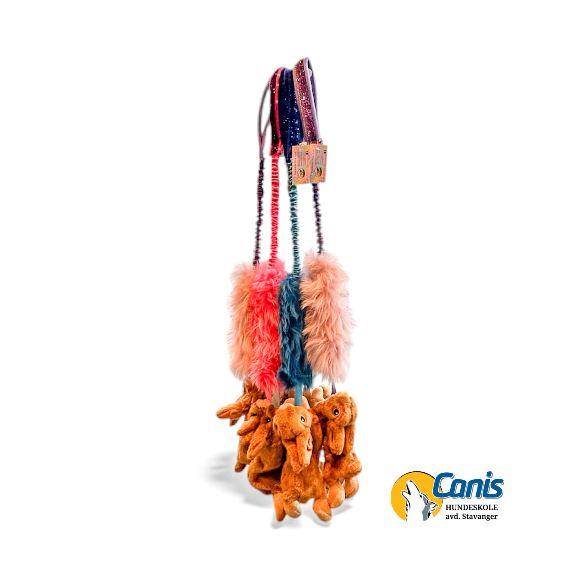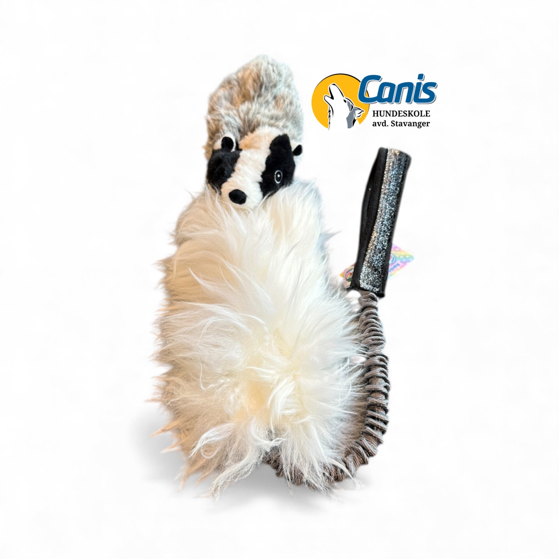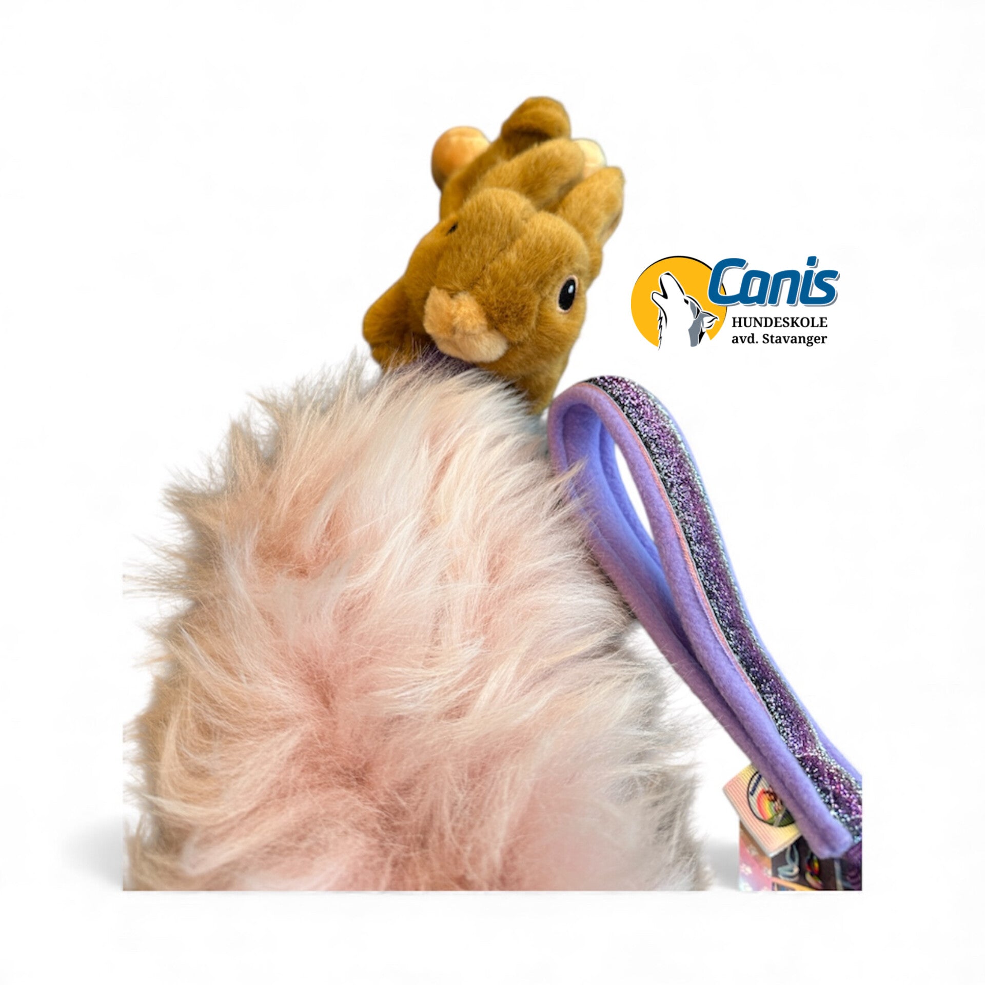 Her får du alt i ett: et knitre-dyr som fanger hundens oppmerksomhet, et stykke håndfarget saueskinn som gjør leken ekstra attraktiv, og et strikkhåndtak som både skåner fører og hund for rykk – samtidig som det øker intensiteten og gleden i draleken.