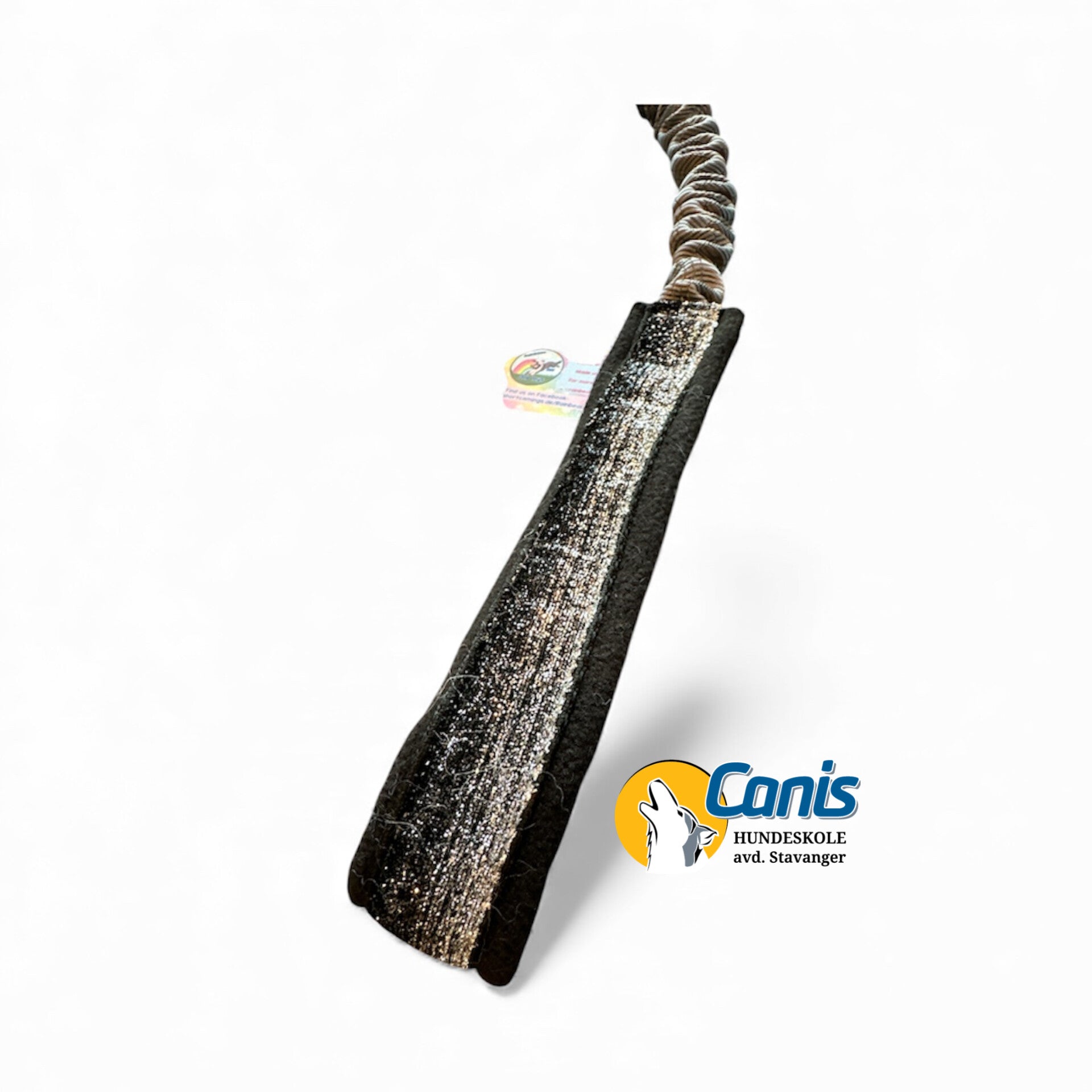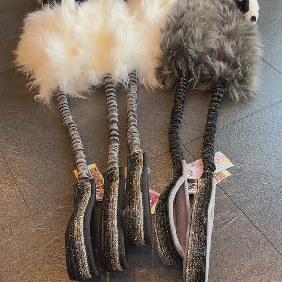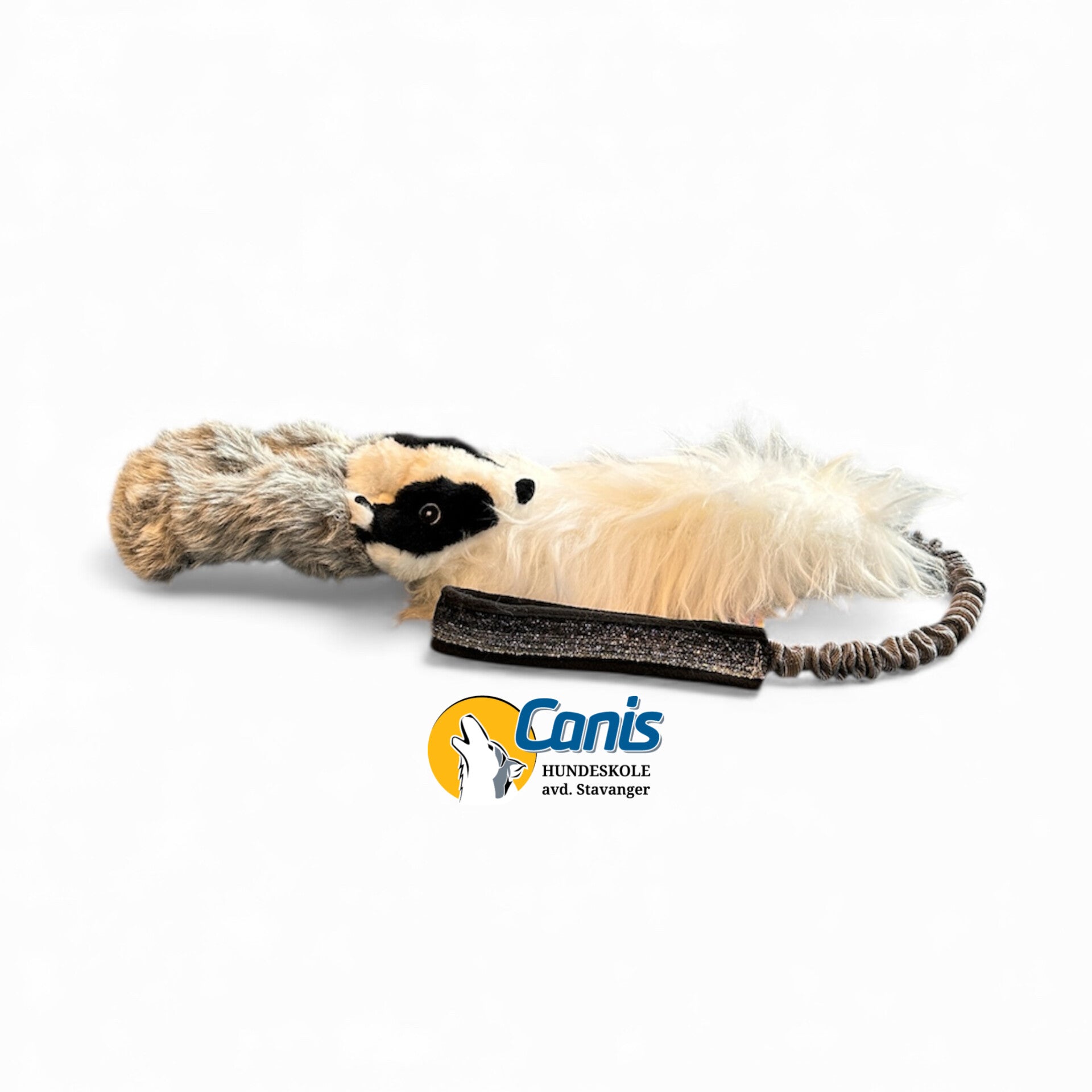 Her får du alt i ett: et knitre-dyr som fanger hundens oppmerksomhet, et stykke håndfarget saueskinn som gjør leken ekstra attraktiv, og et strikkhåndtak som både skåner fører og hund for rykk – samtidig som det øker intensiteten og gleden i draleken.