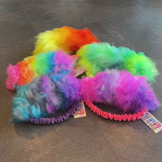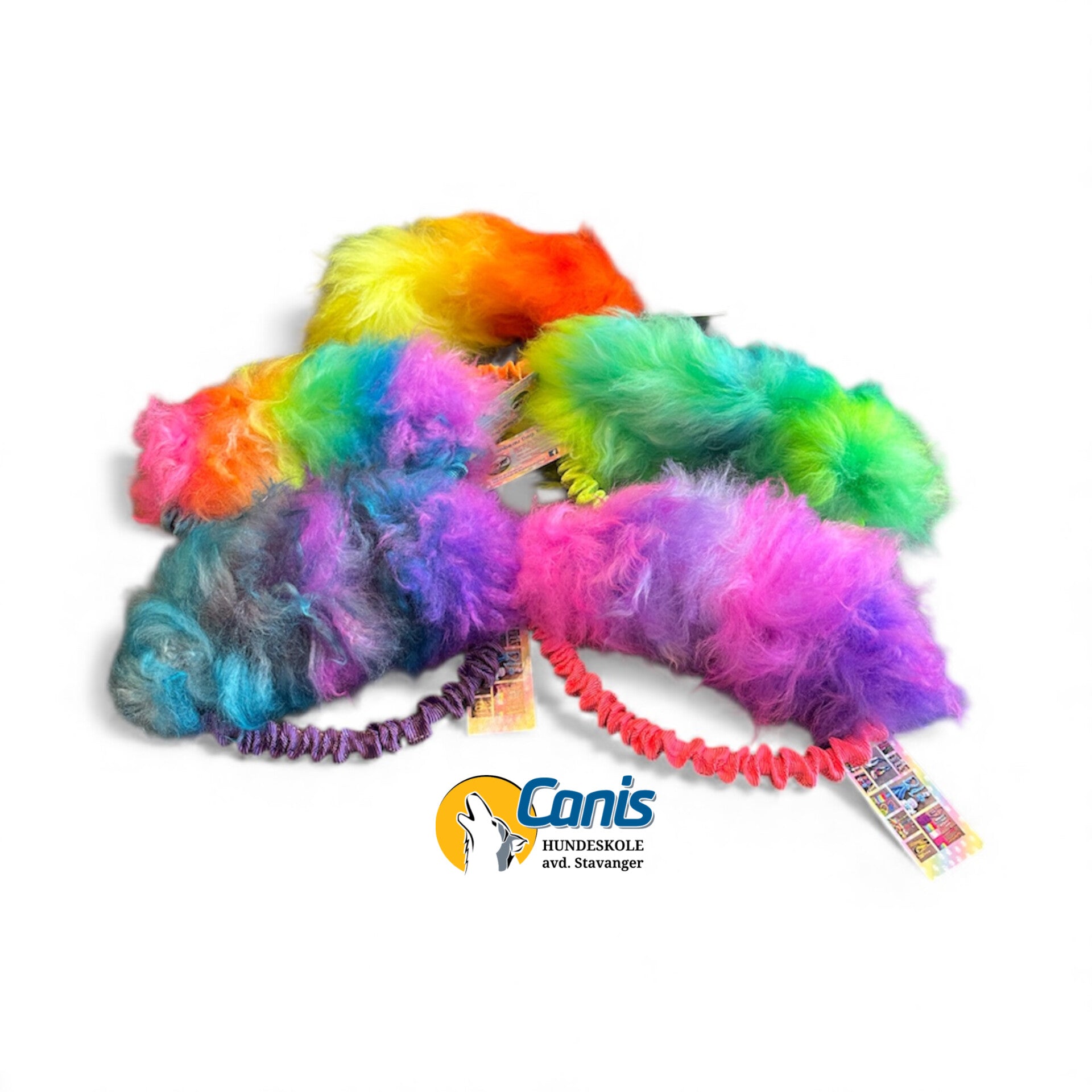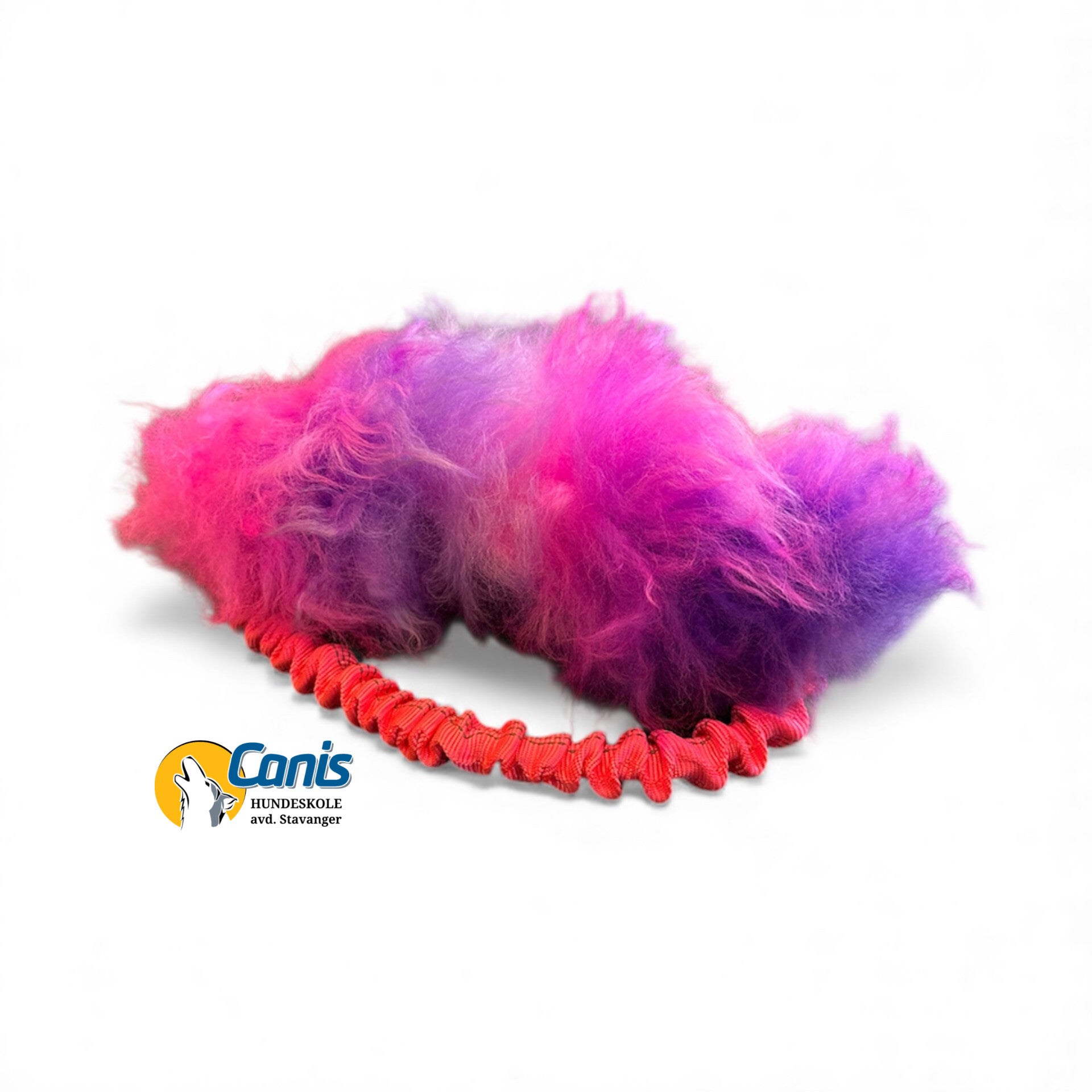 En fargerik og morsom hundeleke laget av håndfarget saueskinn i sprelske farger. Kampringen gir fluffy og myke bitestykker som hunden elsker å tygge på, samtidig som det komfortable strikkhåndtaket gjør dralek enkelt og skånsomt for både hund og eier.