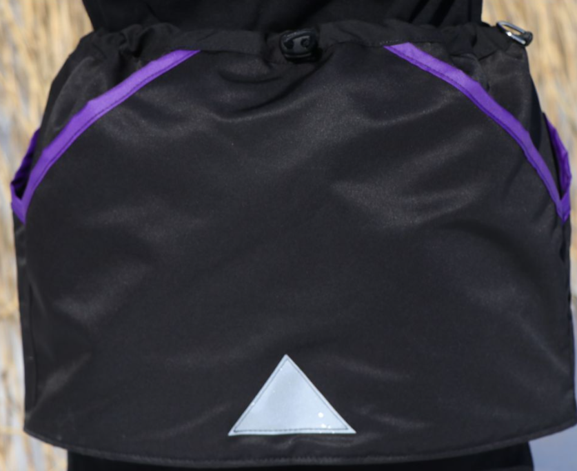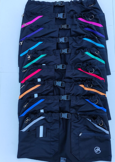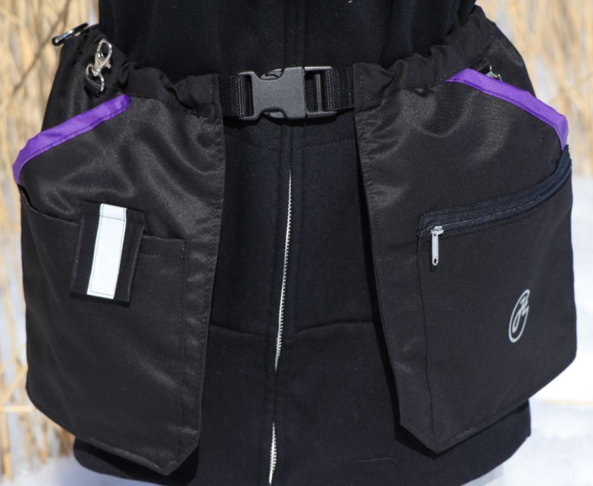 På fronten er det en stor lomme på begge sider; På toppen av disse er det en lomme for mobiltelefonen til høyre og en liten glidelåslomme for nøkler, doggy bags etc. til venstre. I fronten er det også en seleklemme på venstre side og en roterende svingknapp på høyre festet til linningen. På baksiden finner du én stor lomme med en reflekterende trekant og en D-løkke festet til linningen.